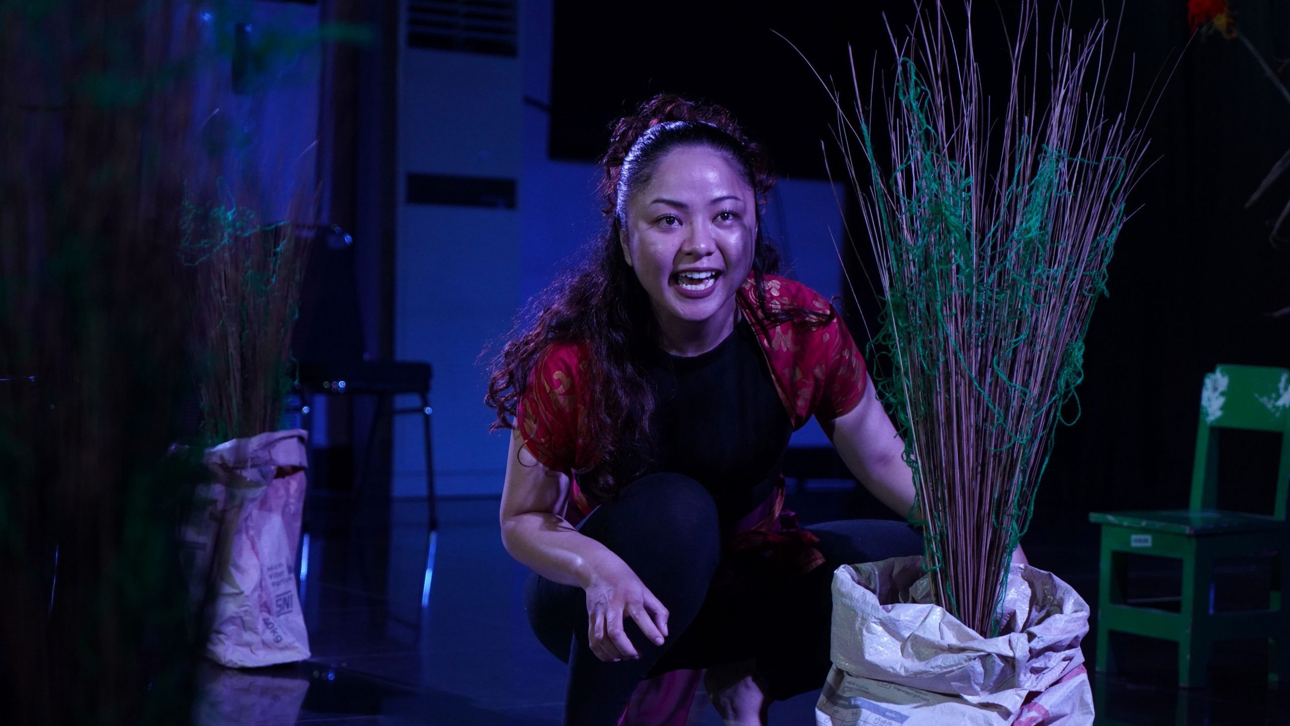 Monolog kedua, Dongeng di Antara Beton dan Pohon, dibawakan oleh Santi Dewi dengan gaya puitik dan simbolik. Dalam lakon ini, ia memerankan sosok binatang yang perlahan kehilangan tempat tinggalnya akibat desakan pembangunan kota. Ruang-ruang hidup alami berubah menjadi beton dengan slogan-slogan ekologis yang menutupi kerusakan sebenarnya. Permainan Santi memadukan bahasa tubuh dan citraan liris yang memancing empati sekaligus ironi terhadap cara manusia memaknai kemajuan.