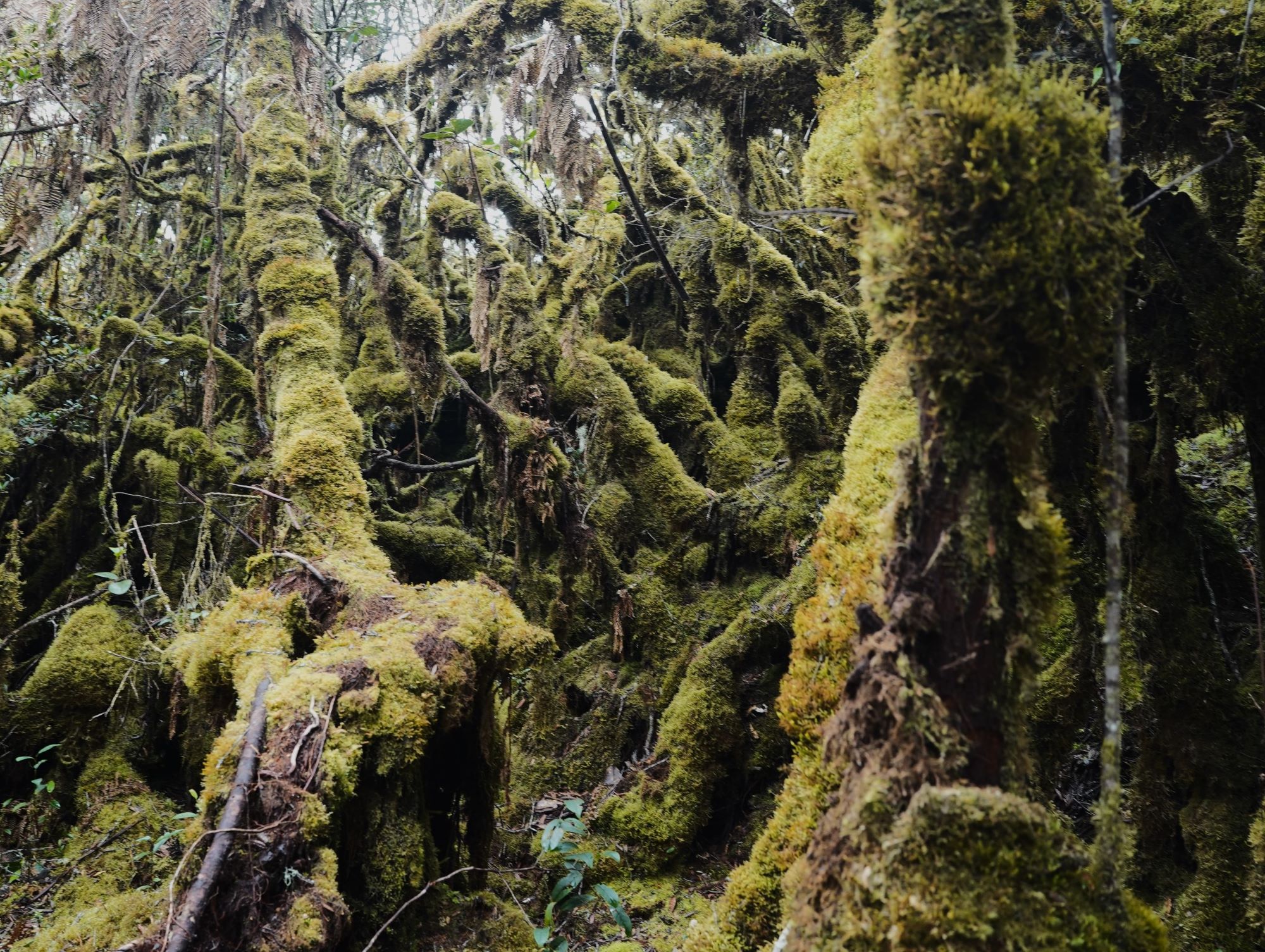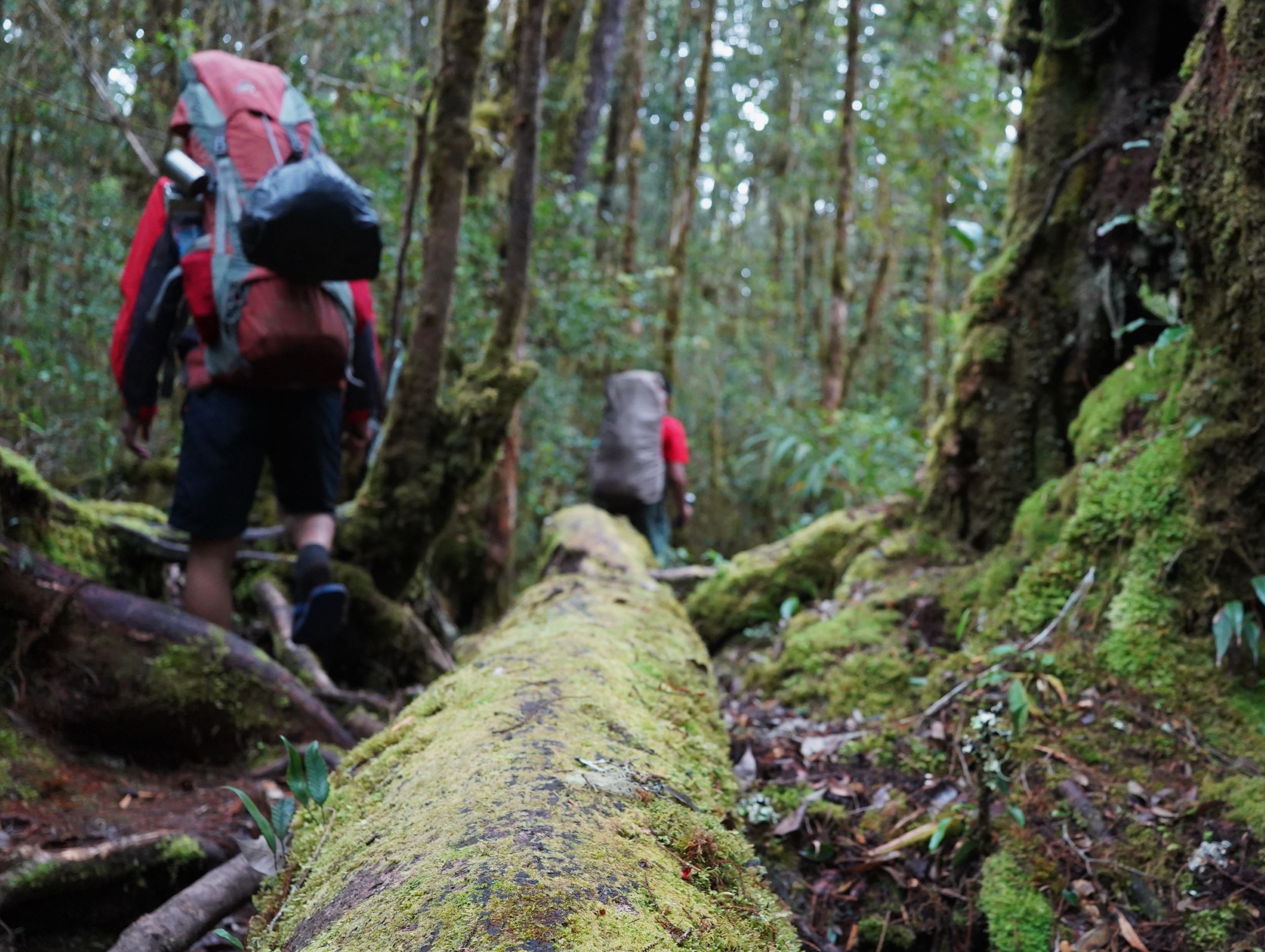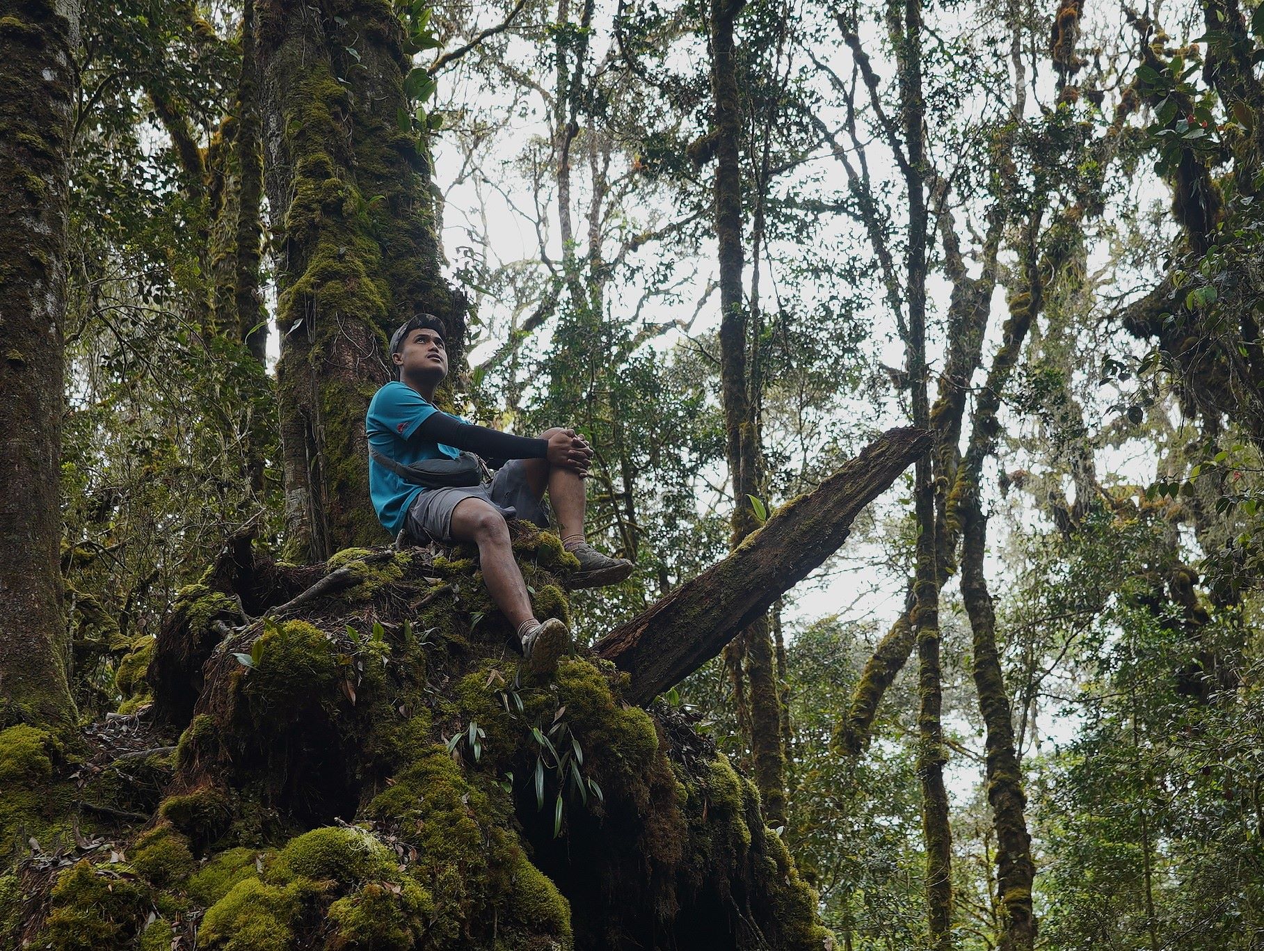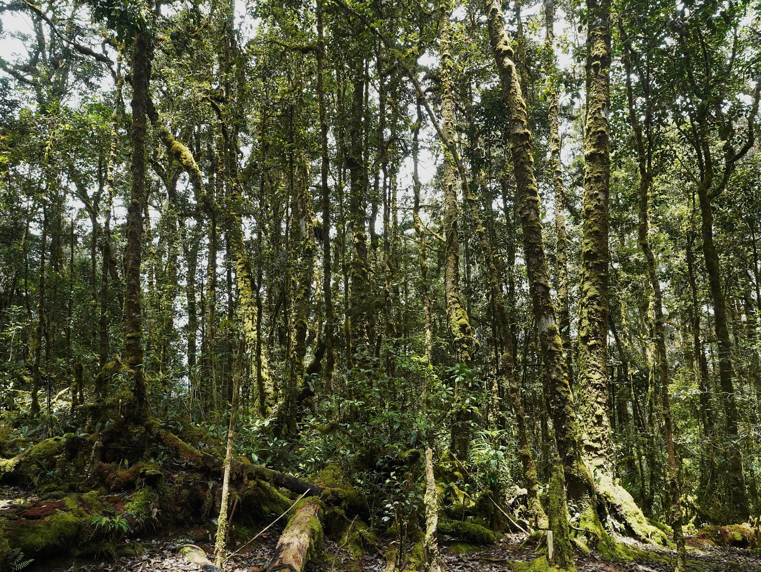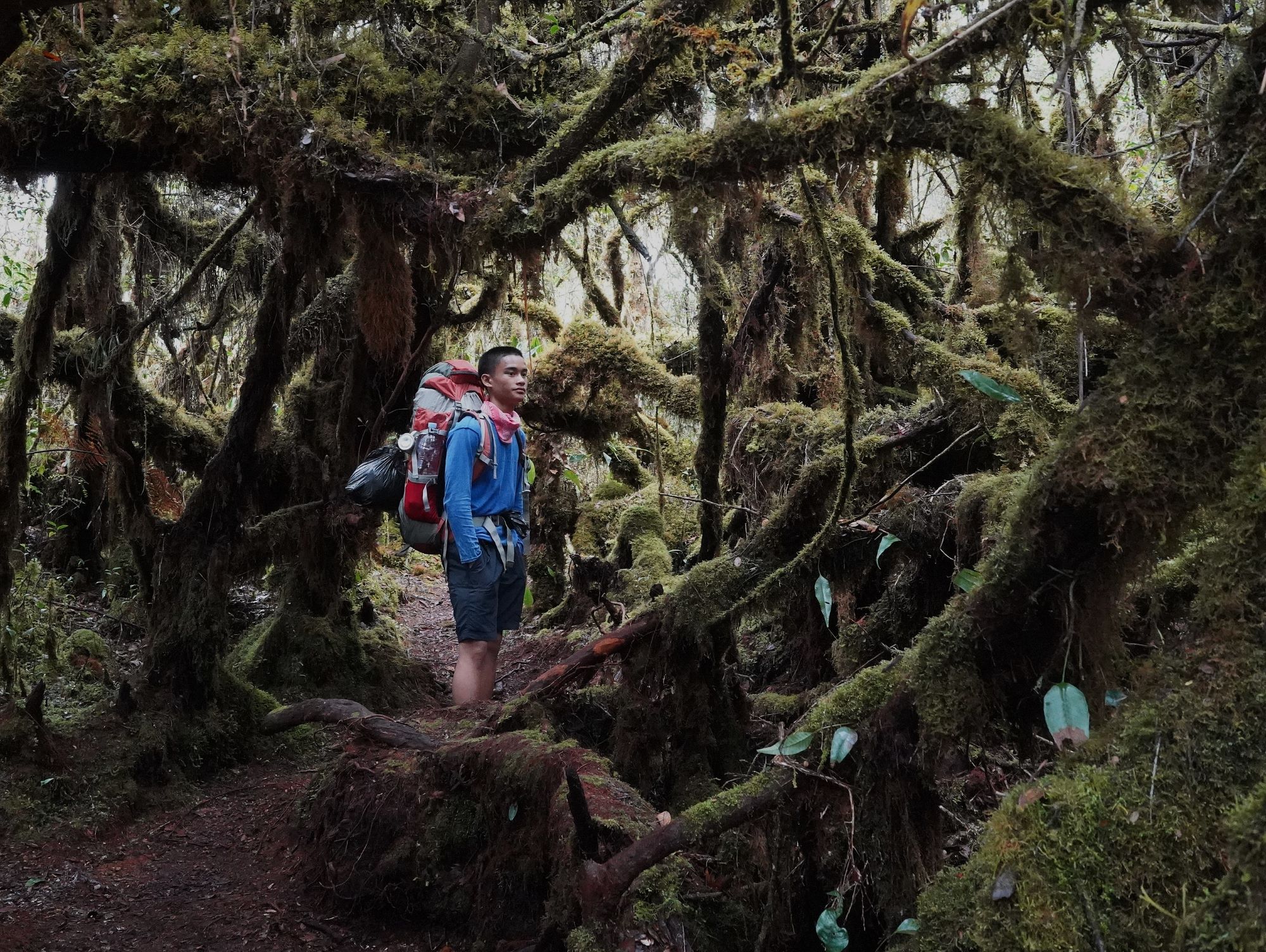 Yang paling membekas justru bukan jalurnya, melainkan apa yang mengelilinginya. Vegetasi pegunungan, dihiasi renda-renda akar angin, berlapis lumut tebal, menggantung di batang pohon, membungkus hampir seluruh lanskap dengan warna hijau yang lembap. Ada kesan tua di sana, seperti ruang yang telah lama hidup tanpa banyak campur tangan manusia.